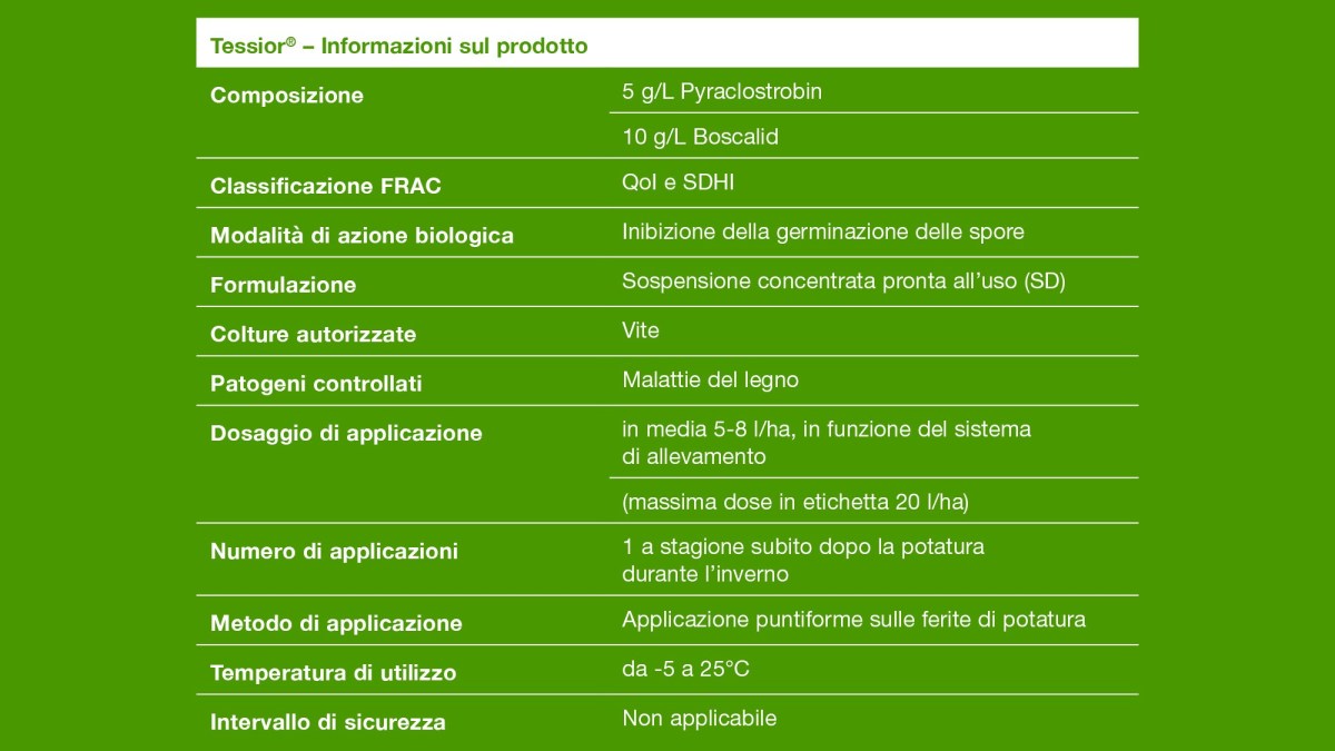 Tessior® contiene un polimero in dispersione acquosa che forma una pellicola protettiva sulla ferita. Oltre al polimero, la formulazione contiene due fungicidi ad ampio spettro: pyraclostrobin e boscalid. In questo modo il sistema crea una barriera sia fisica che chimica, offrendo alla pianta una doppia protezione altamente efficace.