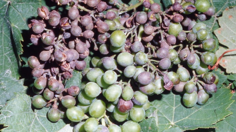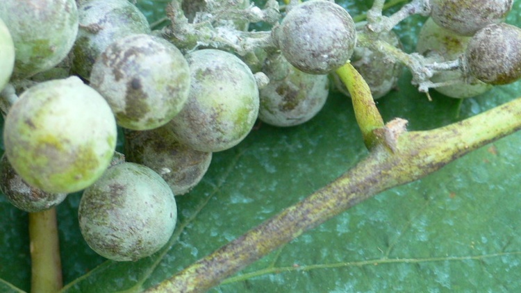 Sugli acini colpiti si forma la caratteristica muffa biancastra, rappresentata dalla vegetazione miceliale del fungo, sotto la quale si notano reticolature necrotiche bruno-nerastre. La porzione colpita, non seguendo l’accrescimento della restante parte dell’acino, porta alla comparsa di profonde spaccature, con messa a nudo dei sottostanti vinaccioli, che favoriscono le infezioni di Botrytis cinerea e di altri microrganismi fungini e agenti batterici.