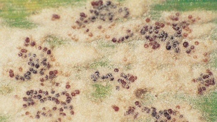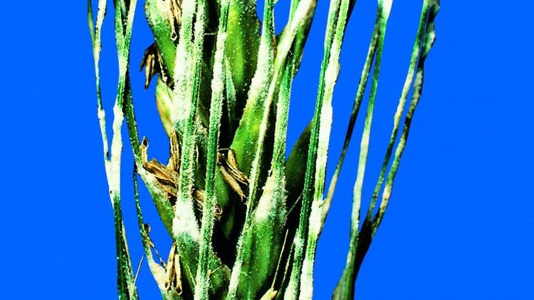 La malattia colpisce le parti verdi della pianta (spighe immature, foglie, culmo), ricoprendole con un feltro miceliale biancastro, formante talora macchie tendenzialmente rotondeggianti, nell’ambito delle quali si formano elementi di forma globosa depressa, della grandezza di una capocchia di spillo, di colore nerastro.